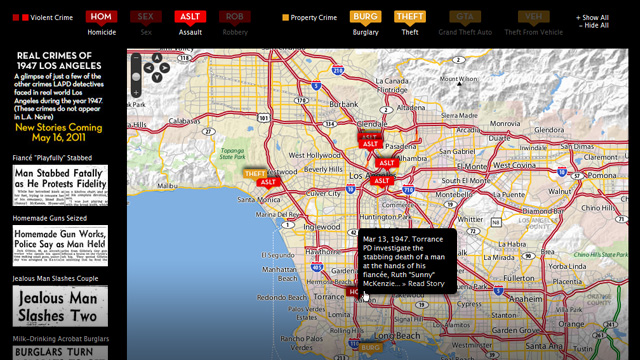 Today, in partnership with the L.A. Times and their Archives group, and inspired by the L.A. Times’ own acclaimed Crime Map project – we present the L.A. Noire 1947 Edition Crime Map some of those other cases from that landmark year of Los Angeles crime that were researched – ranging from the fascinating to the frightening.